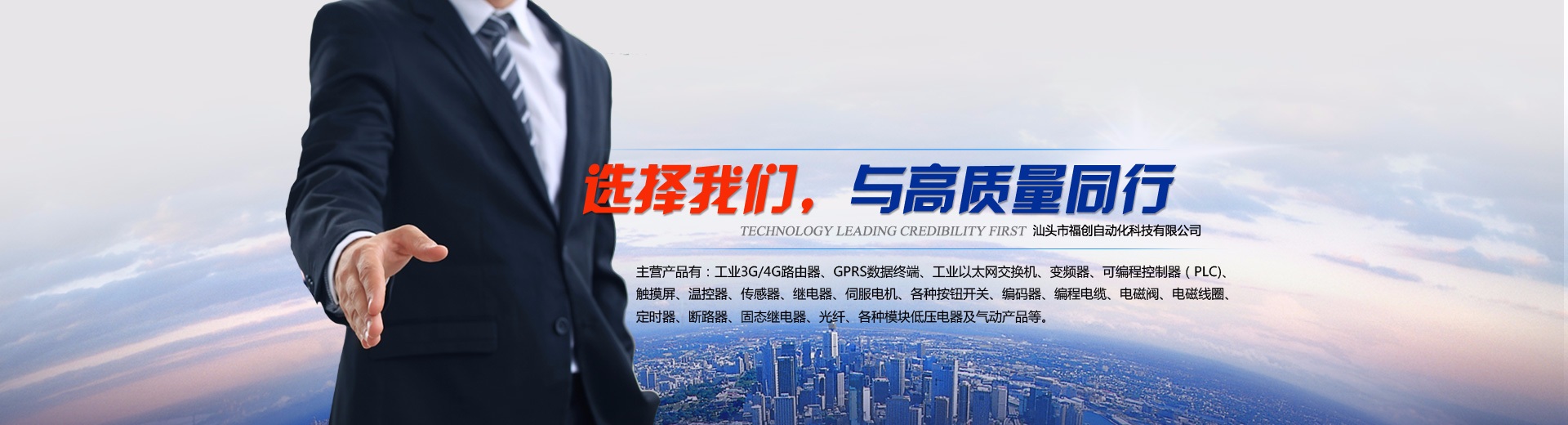 汕頭市福創(chuàng)自動化科技有限公司是一家集自動化元件的代理銷售與維修、自動化設備設計制造、自動化工程安裝改造、機電工程安裝改造、自動化機械設備設計與制造的企業(yè)。  主營產(chǎn)品有:工業(yè)3G/4G路由器、GPRS數(shù)據(jù)終端、工業(yè)以太網(wǎng)交換機、變頻器、可編程控制器(PLC)、觸摸屏、溫控器、傳感器、繼電器、伺服電機、各種按鈕開關、編碼器、編程電纜、電磁閥、電磁線圈、定時器、斷路器、固態(tài)繼電器、光纖、各種模塊低壓電器及氣動產(chǎn)品等。